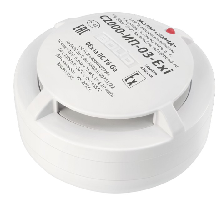 С2000-ИП-03-Exi извещатель пожарный тепловой максимально-дифференциальный адресно-аналоговый взрывозащищенный Болид; IР41; 0,6 мА; -30...+55 °C; 100x47 мм; 0,2 кг.