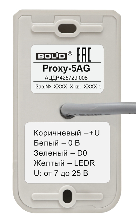 Proxy-5AG считыватель бесконтактный Болид; проксимити карты EM-Marin, ProxCard с интерфейсом Touch Memory; кнопка для команд; дистанция считывания до 10 см; четырёхжильный кабель; встроенный звуковой сигнализатор; питание от прибора, к которому подключен; - 20 + 50 С°; серый; IР20; 43х83х14 мм.