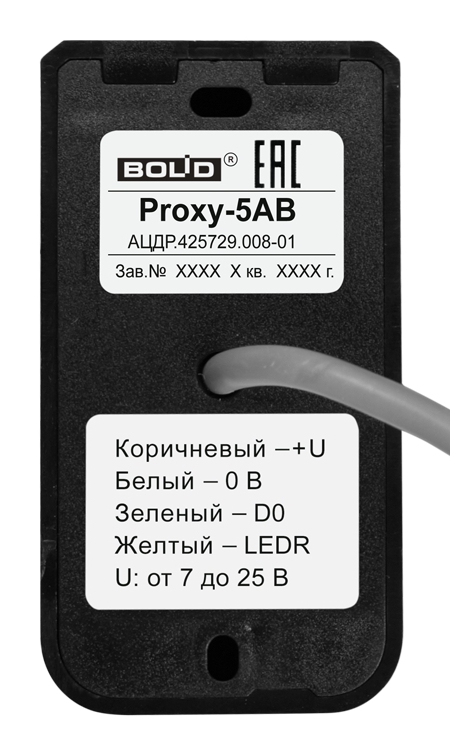 Proxy-5AB считыватель бесконтактный Болид; проксимити карты EM-Marin; ProxCard с интерфейсом Touch Memory; кнопка для команд; дистанция считывания до 10 см; четырёхжильный кабель; встроенный звуковой сигнализатор; питание от прибора, к которому подключен; - 20 + 50 С°; черный; IР20; 43х83х14 мм; 100 г.