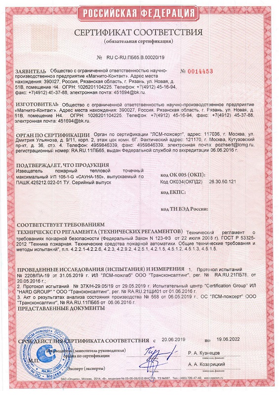 -Извещатели ИП 105-1-(50°С) соответствуют требованиям ГОСТ Р 53325-2012, ФЗ №123-ФЗ от 22.07.2008г. и имеют температуру срабатывания от 46 до 52°С. Степень защиты извещателей, обеспечиваемая оболочкой соответствует IP20 по ГОСТ 14254-96.