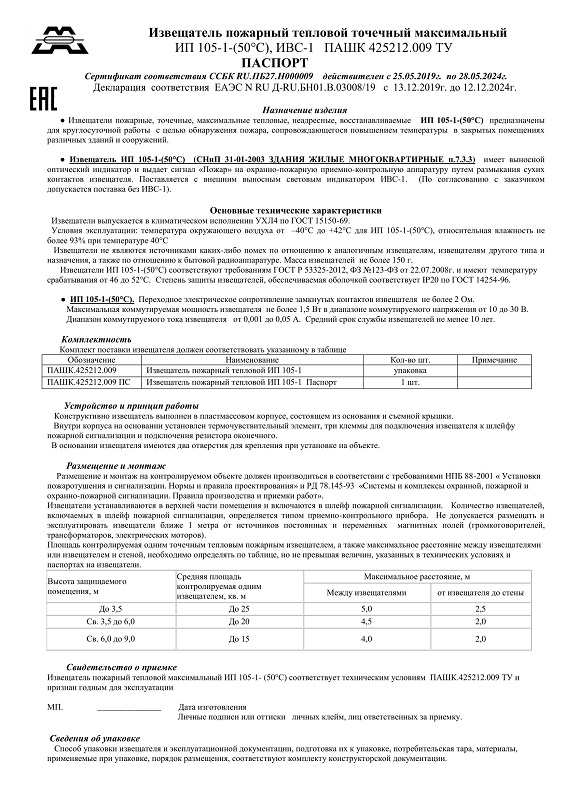 -Извещатели пожарные, точечные, максимальные тепловые, неадресные, восстанавливаемые ИП 105-1-(50°С) предназначены для круглосуточной работы с целью обнаружения пожара, сопровождающегося повышением температуры в закрытых помещениях различных зданий и сооружений.