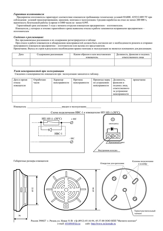 ИП 105-1-50 без ИВС извещатель пожарный тепловой максимальный Магнито-Контакт; t-сраб. 48...52°С; U-коммут.10...30В; I-коммут. 0,001...0,05А; IP20; -40...+42°С; без выносного индикатора; 98х23мм; 150г.