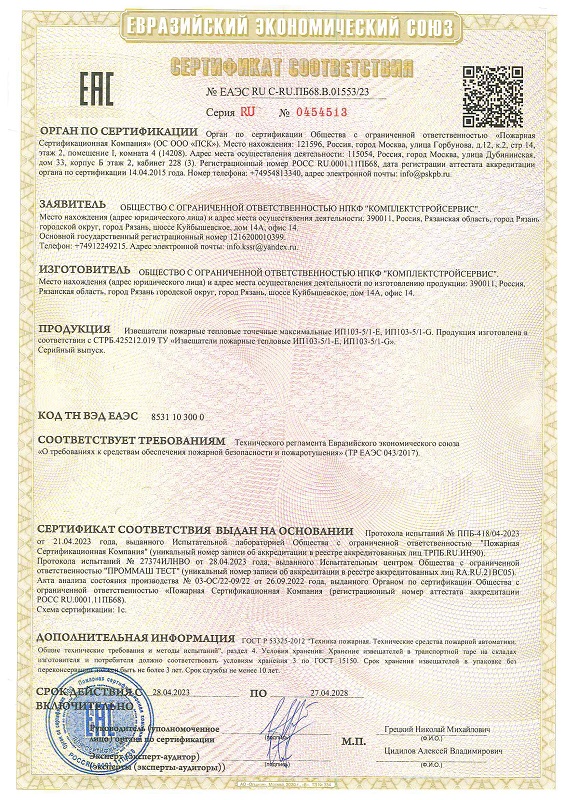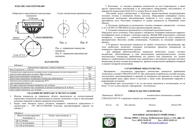 ИП 103-5/1-G • (н.з.) извещатель пожарный тепловой максимальный КомплектСтройСервис; 20Мом; 93%; -50; 30г.