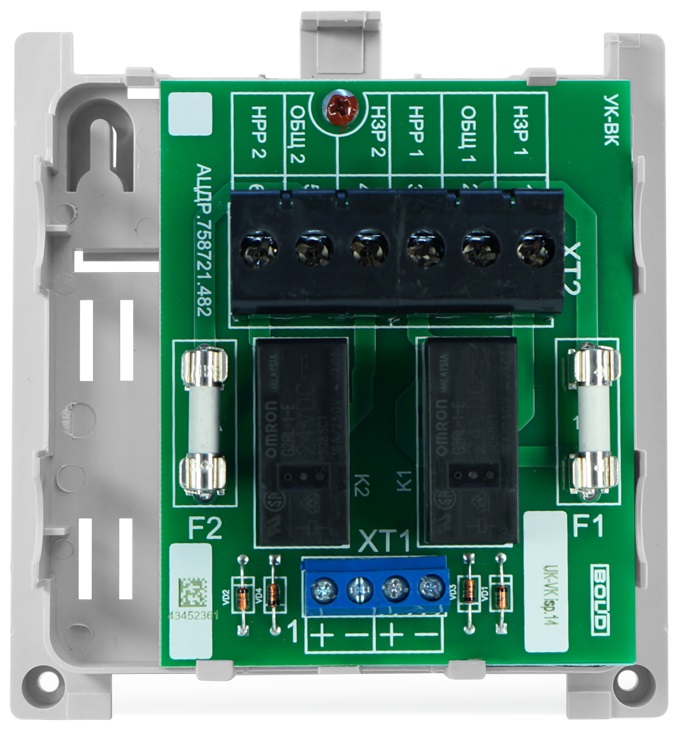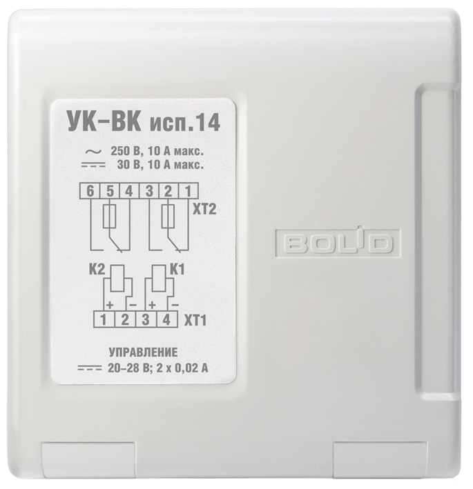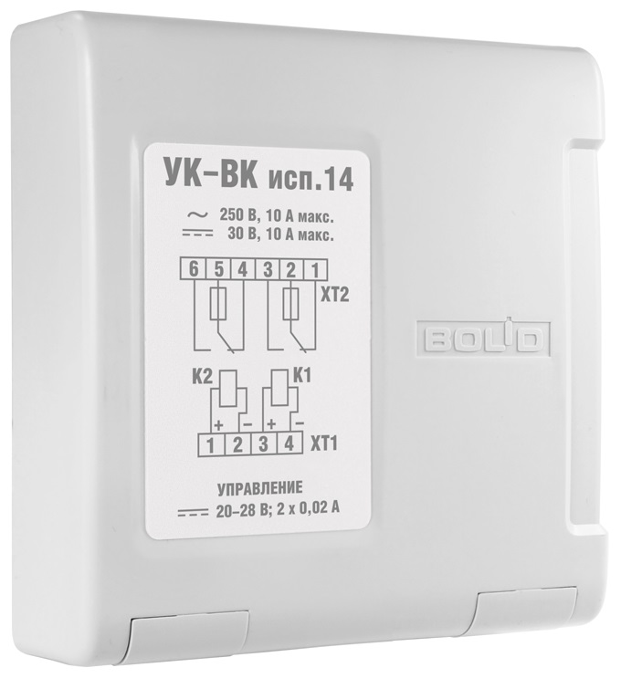 УК-ВК исп.14 устройство коммутационное Болид; 2 реле, контакты на переключение; U-упр.24 В; I-упр.20 мА; U-коммут. до 250 В; I-коммут.до 10 А; IP30; t-раб.-30...+50°С; 102х107х39 мм.