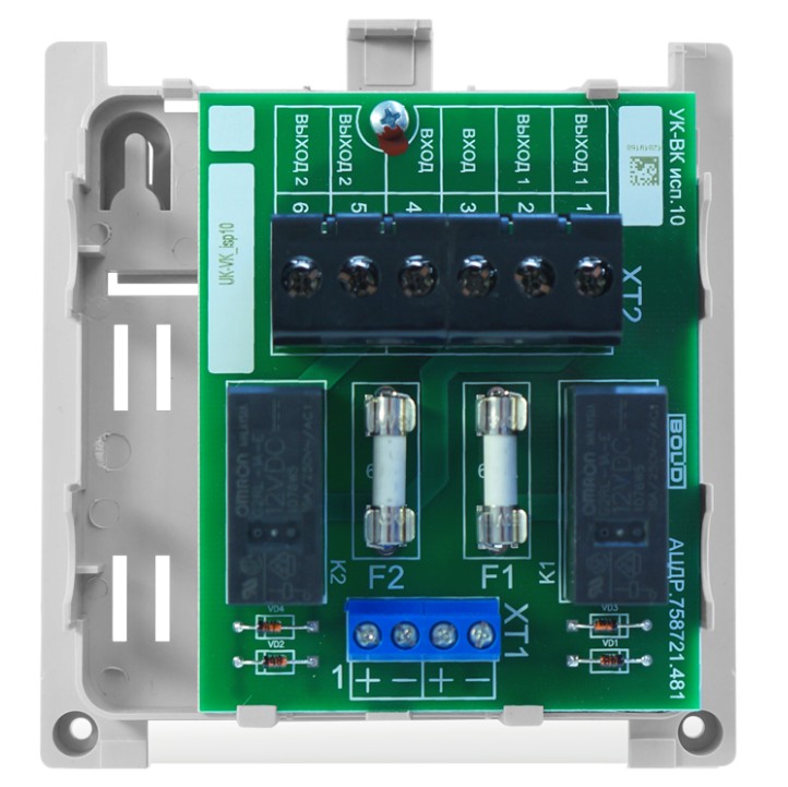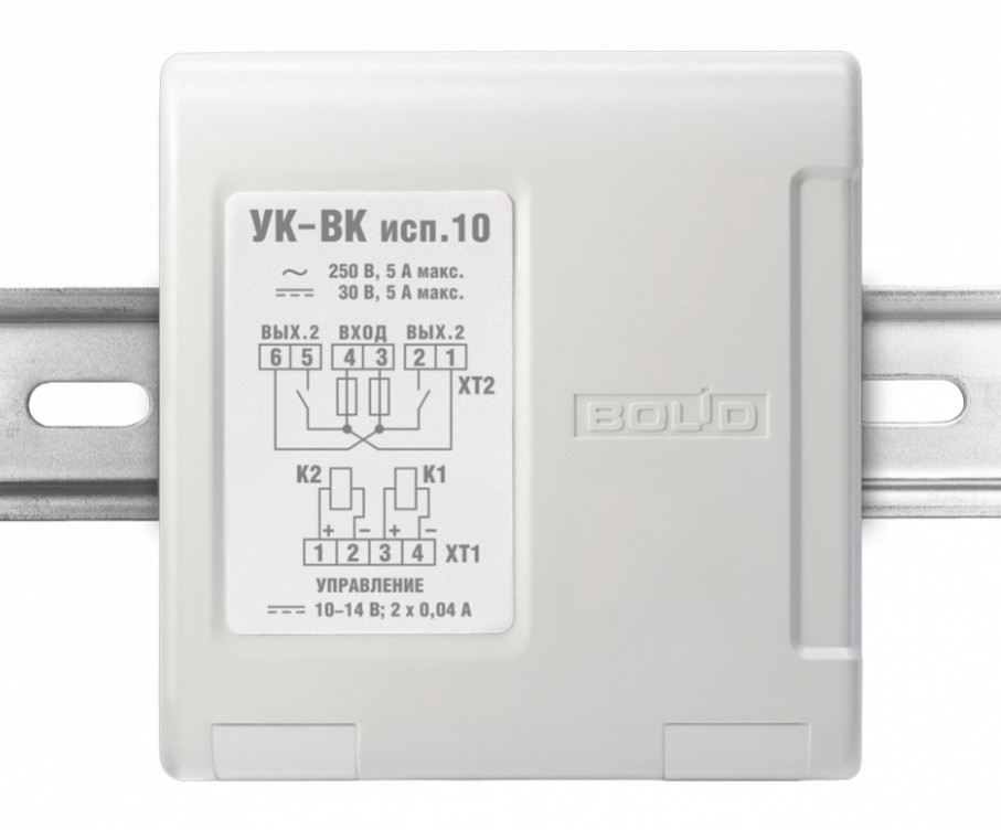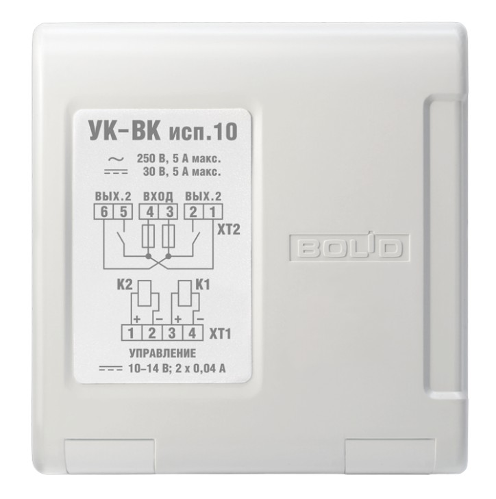 УК-ВК исп.10 устройство коммутационное Болид; 2 реле, контакты на замыкание; U-упр.12 В; I-упр.40 мА; U-коммут. до 250 В; I-коммут.до 5 А; IP30; t-раб.-30...+50°С; 102х107х39 мм; 200 г.