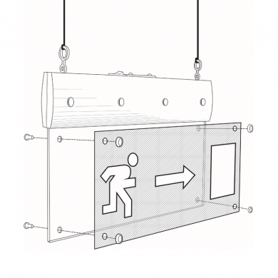 Потолочное крепление позволяет крепить изделие таким образом, что просматриваемым остается только стекло с надписью. Подойдет для всех типов подвесных потолков.