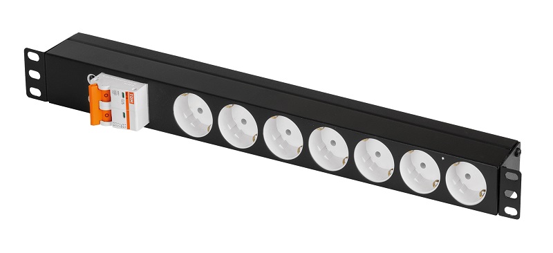 Блок электрических розеток TLK-RS07M-C25-BK в 19” стандарте с высотой 1U. Блок состоит из 7 «евророзеток» (Schuko), соединенных латунными шинами питания марки Л63Т с сечением 6 мм2 каждая. Блок розеток имеет автоматический выключатель 2/25А (по предварительному заказу модель автоматического выключателя может быть другая). Суммарный ток нагрузки — не более 25А. В задней части блока розеток имеется место для ввода кабеля питания (поставляется отдельно). Корпус изготовлен из оцинкованной стали толщиной 0,7 мм, все металлические элементы блока розеток заземлены, также имеется элемент крепления внешнего заземления (отверстие с резьбой М4).