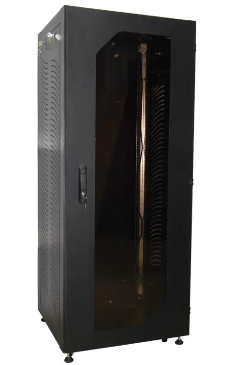 Шкаф телекоммуникационный 19" напольный 18U чёрный на 5 приборов ТШ-186060Ч5 (RAL 9005, 600x600, полезная глубина 506мм, дверь стекло, в комплекте вентиляторный блок с проводом и вилкой 220В, термостат, кронштейн, блок розеток на 8 гнезд, 5 полок, 5 фальш панелей, метизы, провода заземления).
