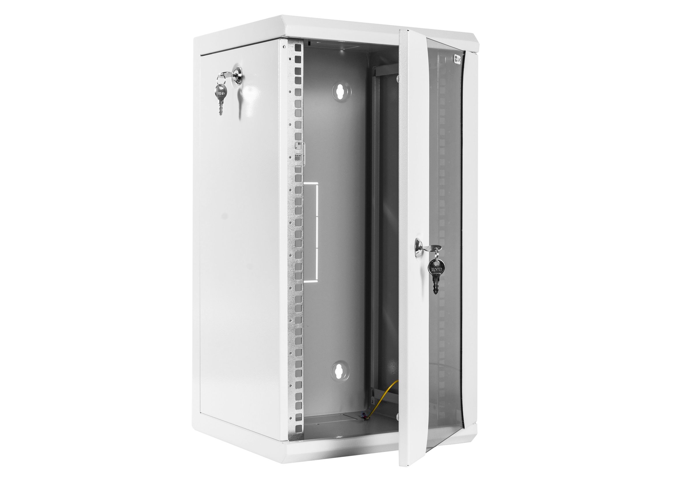 Кабельные вводы расположены в верхней и нижней частях шкафа. Задняя стенка имеет дополнительный кабельный ввод и четыре отверстия для крепления шкафа к стене. Предусмотрена система заземления.