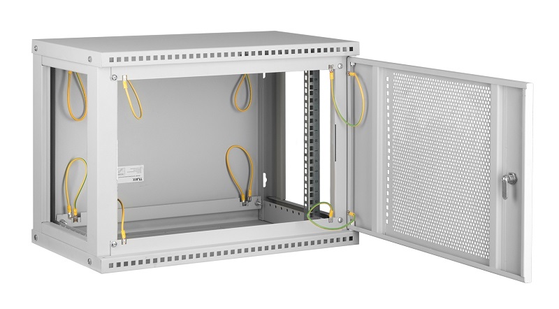 Настенные шкафы серии Lite (TWI) — это рациональное решение для размещения малых объемов телекоммуникационного оборудования, внутри жилых, офисных и производственных помещений. Настенные шкафы используют там, где применение напольных шкафов нецелесообразно. Например, при ограниченной площади помещения или при организации ЛВС с небольшим количеством рабочих мест. Особенностью настенных шкафов серии TWI является: надежная сборная конструкция, для удобства траспортировки, наличие съемных боковых стенок, двери с большим углом открытия позволяют при необходимости осуществлять доступ к оборудованию с трех сторон. Сборно-разборная конструкция шкафа, состоящая из малого набора конструктивных элементов обеспечивает надежный конструктив и простоту сборки. Крепление шкафа к стене осуществляется через монтажные отверстия в задней стенке шкафа. (Крепеж не входит в комплект поставки). Дверь шкафа снабжена замком и может быть выполнена из стального листа с перфорацией или со вставкой из ударопрочного, тонированного в массе стекла. Имеется возможность навесить дверь с правой или с левой стороны. Угол открытия двери — 180 градусов. Для дополнительного удобства монтажа и обслуживания устанавливаемого оборудования, конструкцией предусмотрены легкосъемные боковые стенки, в закрытом положении фиксируются замками. Для установки оборудования стандарта 19", шкаф оснащен одной парой монтажных направляющих в комплекте с юнитовой наклейкой (шкаф глубиной 600 мм оснащается двумя парами монтажных направляющих). Глубину установки оборудования на монтажных направляющих внутри шкафа можно изменять с шагом 25 мм. Перфорация шкафа обеспечивает хорошую вентиляцию установленного оборудования. Возможна установка вентиляторного блока в крышу и основание шкафа, для этого предусмотрены выламываемые заглушки. В шкаф глубиной 350 мм устанавливаются вентиляторные блоки с 1-м вентилятором, а в шкаф глубиной 450 и 600 мм устанавливаются вентиляторные блоки с 2-я вентиляторами. Имеется по 1-му кабельному вводу в крыше и в основании шкафа, выполнены они в виде прямоугольных выламываемых заглушек 270х56 мм. Все токопроводящие части шкафа заземлены между собой. Антикоррозионное покрытие выполнено ударопрочной порошковой краской. Шкаф выполнен в системе несущих конструкций серии 482,6 мм ГОСТ 28601-90 (19-дюймовому стандарту IEC 297). Максимальная допустимая распределенная нагрузка на шкаф серии TWI составляет 40 кг. Степень защиты шкафа составляет IP 20. Шкаф поставляется в разобранном виде, в одной коробке.