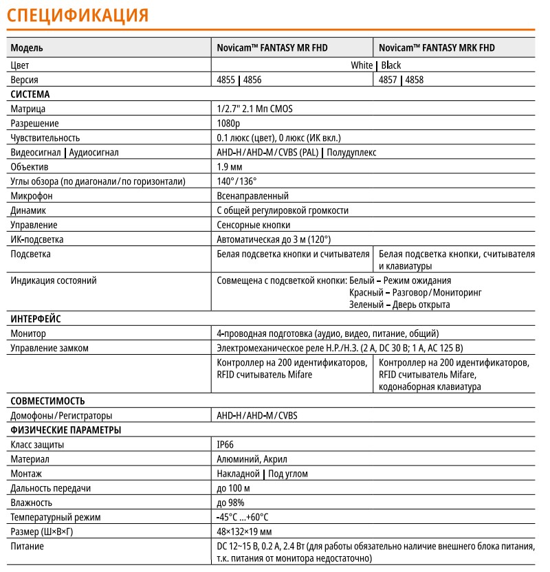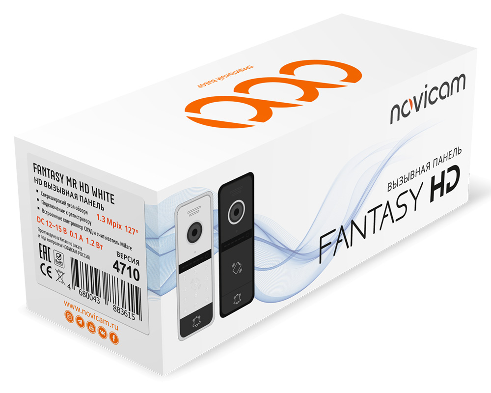FANTASY MR FHD WHITE (ver.4855) вызывная панель Novicam; AHD-H/AHD-M/CVBS (PAL); фокусное расстояние 1.9 мм; угол обзора диаг/горизонт: 140°/136°: всенаправленный микрофон; сенсорная кнопка; SMART подсветка; встроенные СКУД и Mifare; автоматическая ИК-подсветка до 3м (120°); электромеханическое реле; цв. белый; алюминий; IP66; -45° ~ +60°С; 48x132x19 мм.