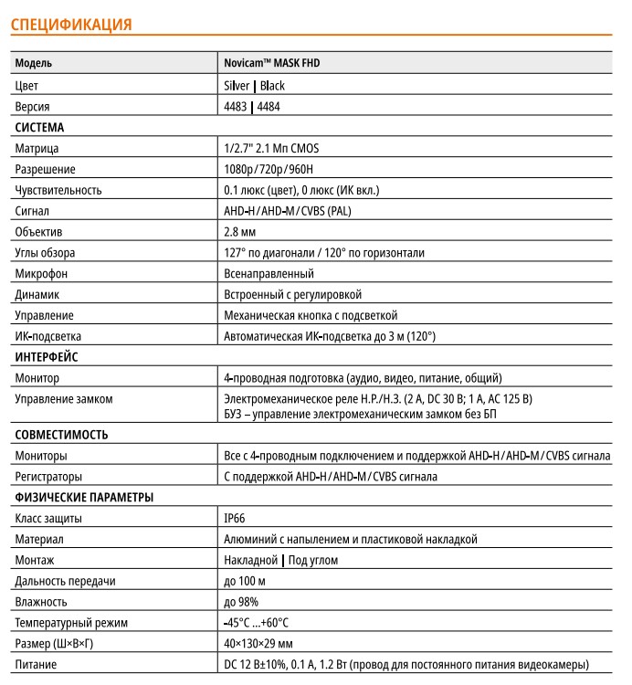 MASK FHD BLACK (ver.4484) HD вызывная панель Novicam; AHD камера: 2.8 Мп (переключение AHD-H/AHD-M/CVBS); (720p); ИК 3м; реле Н.Р./Н.З.; работа в качестве камеры; фокусное расстояние: 2.8 мм; угол обзора Д/Г: 127°/120°; питание DC 12-15В; механическая кнопка; угловое крепление и козырёк в комплекте; цвет корпуса: черный; IP66; -45° ~ +60°С; 40x130x29 мм.