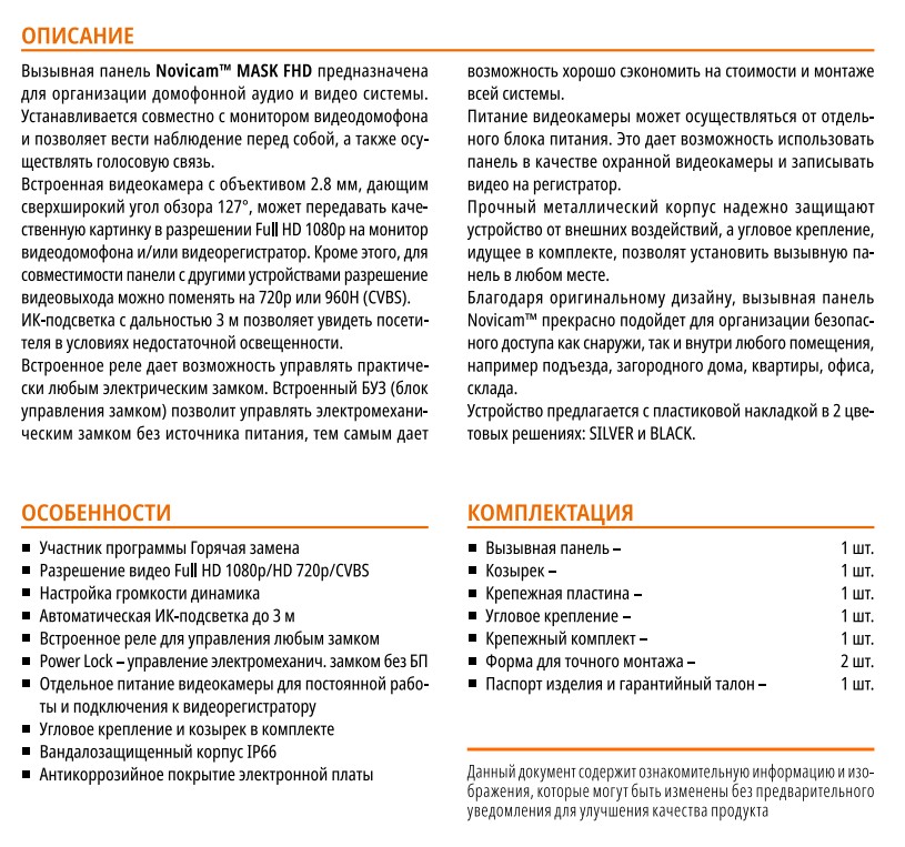 Вызывная панель Novicam MASK FHD предназначена для организации домофонной аудио и видео системы. Устанавливается совместно с монитором видеодомофона и позволяет вести наблюдение перед собой, а также осуществлять голосовую связь.