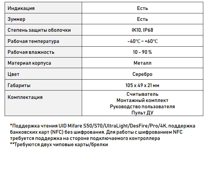 Расшифровка: *Поддержка чтения UID Mifare S50/S70/UltraLight/DesFire/Pro/4K, поддержка банковских карт (NFC) без шифрования. Для работы с шифрованием NFC требуется поддержка на стороне подключаемого контроллера **Требуются двух чиповые карты/брелки
