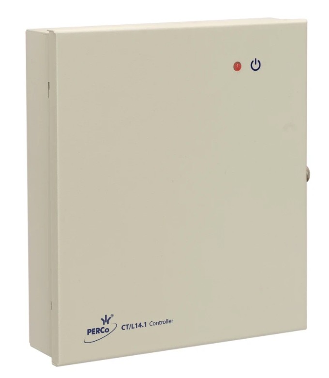 PERCo-CT/L14.1 универсальный контроллер замка/турникета/шлагбаума PERCo; 50 000 пользователей; 150 000 событий; до 8 считывателей PERCo по интерфейсу RS-485; выходы: 3 "ОК" 30 В/0,25 А; 4 реле 30 В/5 А; питание 12 В/0,25 А; +1…+40 °C; 208х235х45 мм; 1,8 кг.