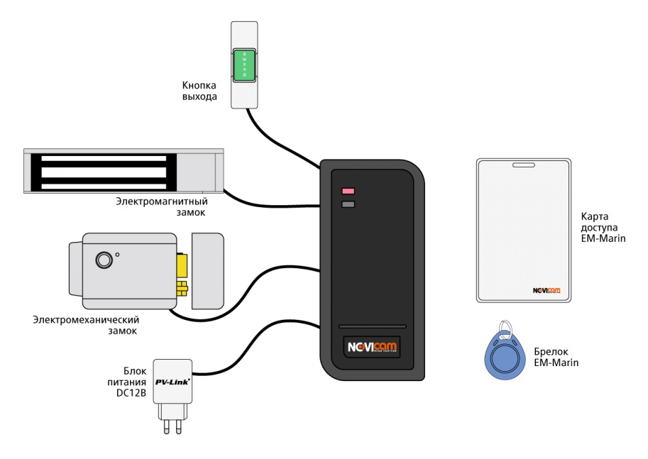 Изделие имеет возможность подключения электромеханического или электромагнитного замка, а также кнопки выхода. Устройство может эксплуатироваться вне помещений.