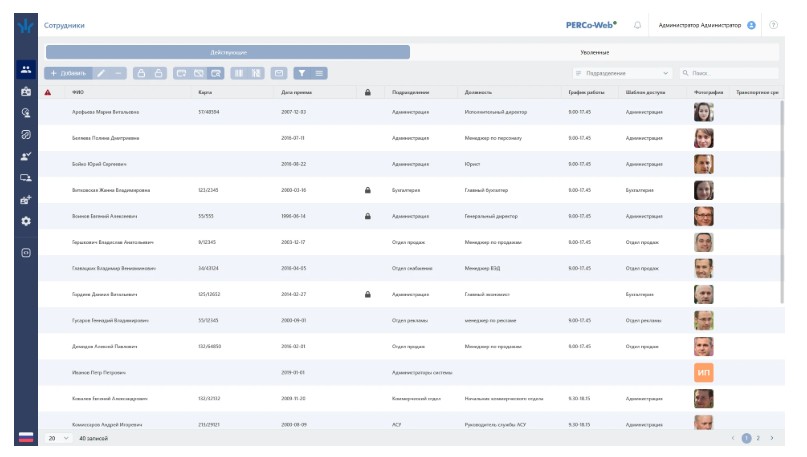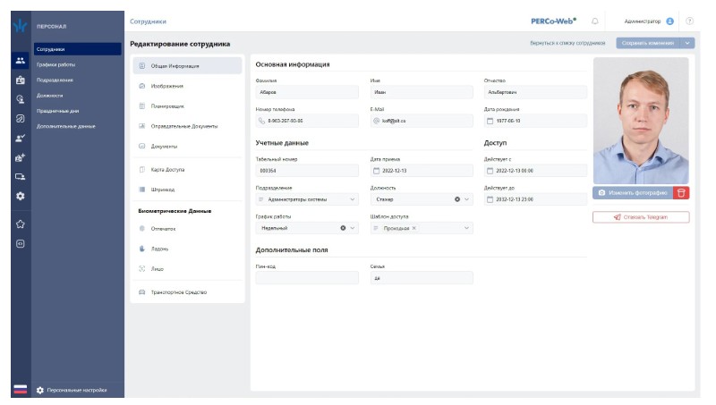 позволяет автоматизировать процесс ввода и хранения учетных данных сотрудников. В учетные данные персонала можно добавить дополнительную информацию о транспортных средствах – до четырех ТС на каждого из сотрудников. В разделе предусмотрена возможность ведения списка должностей и подразделений предприятия. В Базовом ПО отсутствует возможность создания Графиков работы, создания Дизайна пропусков, работы с Дополнительными данными.
