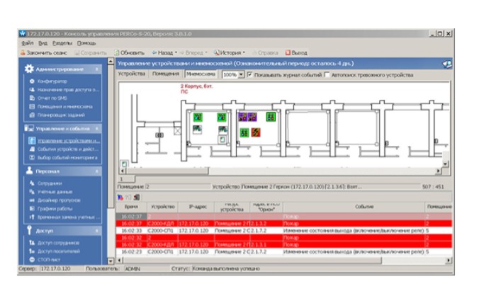 Возможность непрерывного контроля охранно-пожарной обстановки с ее визуализацией на мониторе сотрудника безопасности и оперативного реагирования на нештатные ситуации реализуется в разделе S-20 «Центральный пост охраны».