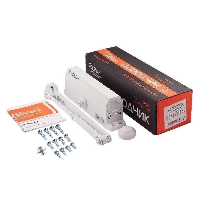 НОРА-М №4S (до120кг) доводчик морозостойкий (белый); длина рычага от 260 до 330 мм; посадочные размеры 206х19 мм; материал корпуса силумин; от -45 °С до +60 °С; длина 223 мм.