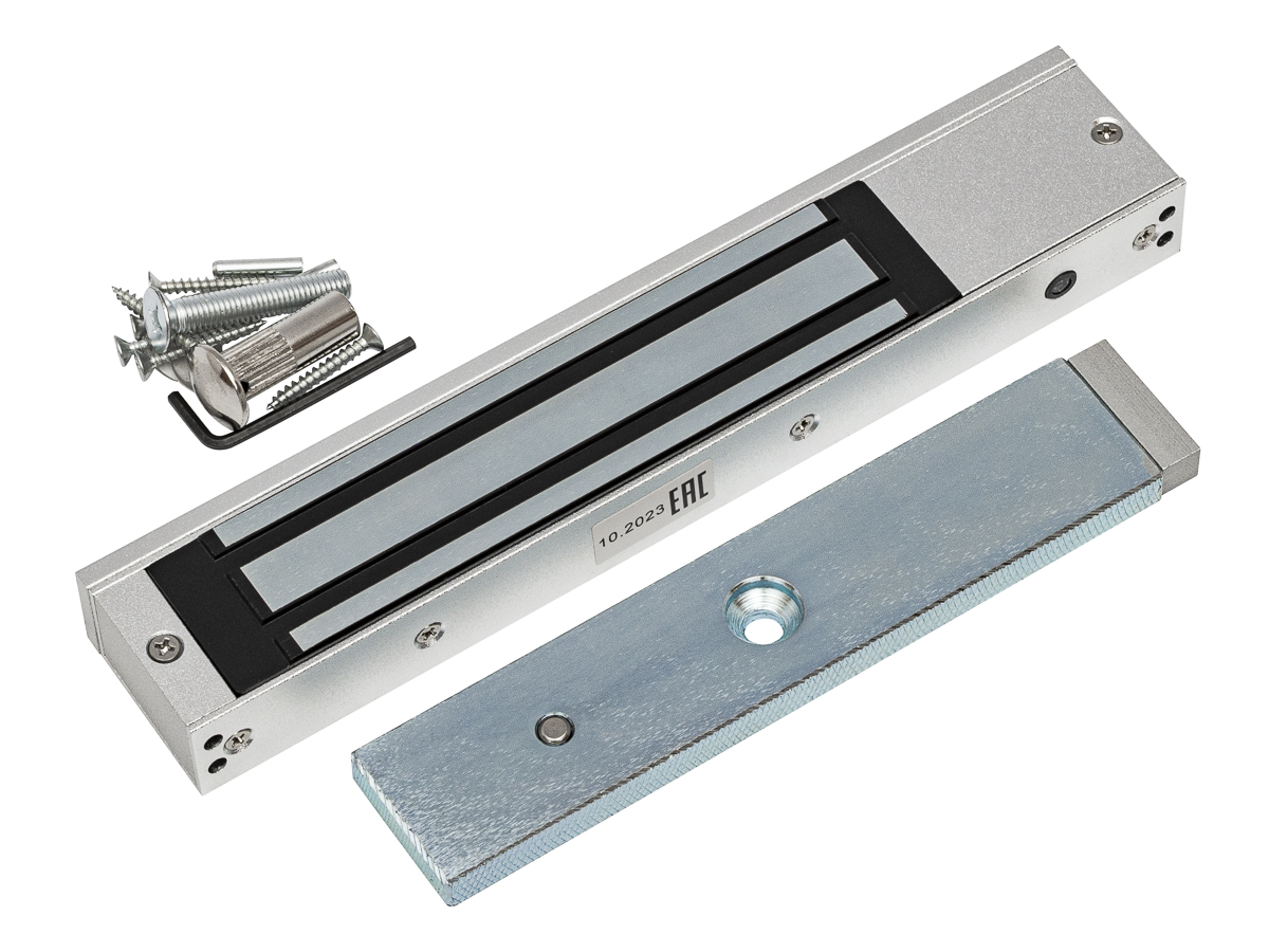 Электромагнитный замок, 12V/24V DC, не более 0,48 A, усилие 300 кг, габаритные размеры 253x43x28 мм. Масса брутто 2000 г., офисный дизайн, планка в комплекте, световая индикация, Датчик Холла положения замка (выход реле НО, НЗ), датчик положения двери (геркон).