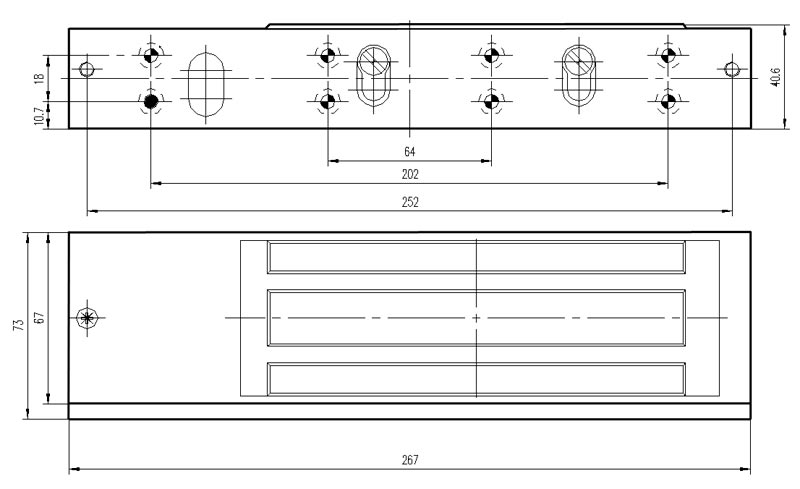 ST-EL500ML замок электромагнитный Smartec; сила удержания 500 кг; 12/24 В постоянного тока, 540 мА/270 мА; -10...+55°С; 267x67(+6)x40 мм (замок), 185x61x15 мм (якорь); 4,6 кг.