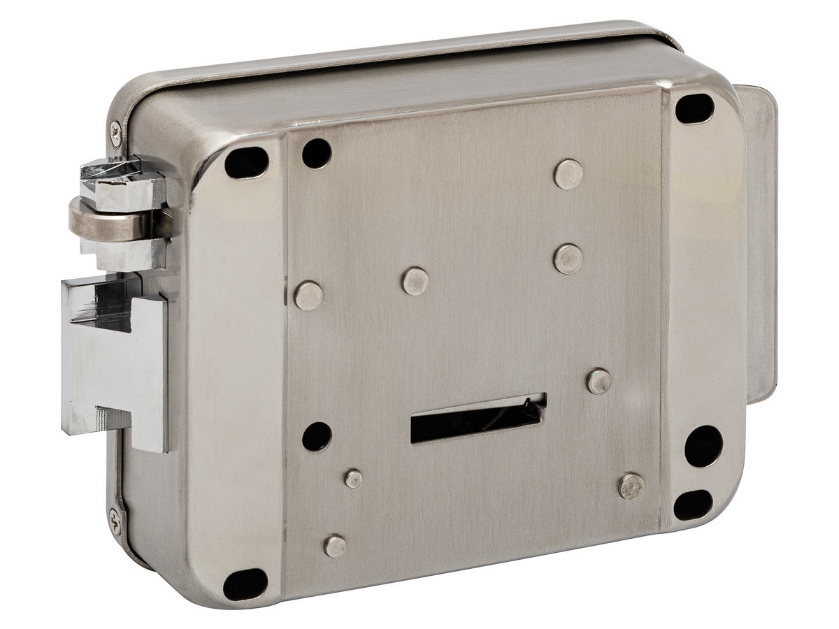 Электромеханический замок, накладной, универсальный (дверь наружу, внутрь), ролик взвода пружины, блокировка ключом в закрытом состоянии, нержавеющая сталь, 12В, цвет серебро. Габаритные размеры: 163x47x103 мм. Масса брутто: 1300 г.Темп.диапазон -30°С…+50°С