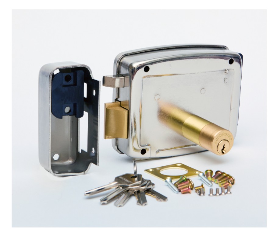 AT-EL101GF.1 (открывается внутрь, петли слева) (серебро) замок электромеханический накладной ACCORDTEC; рабочее напряжение 12V DC; рабочий ток до 3,5A (импульс до 1 сек.); никелированная сталь; накладная; ток потребления 3500 мА; от -30 до +50 °С; 148x107x35 мм; 1300 г.