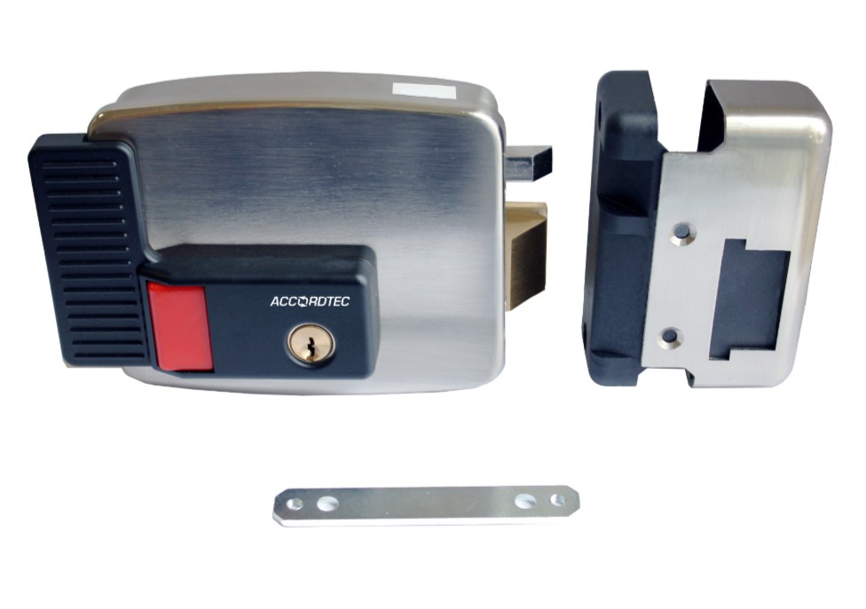 AT-EL101GF.3 (открывается наружу, петли слева) (серебро) замок электромеханический накладной ACCORDTEC; напряжение питания 12 В; ток потребления 3500 мА; никелированная сталь; от -30 до +50 °С; 148x107x35 мм; 1300 г.
