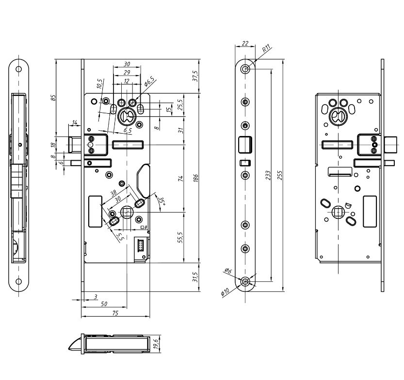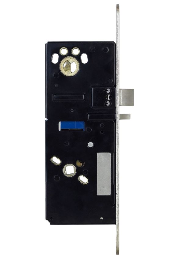 Совместимость с фурнитурой Abloy. Замок имеет размеры и технологические отверстия, точно соответствующие замку EL595FU, поэтому к нему подходят цилиндровые механизмы, ручки, нажимные штанги и ответные планки от финского производителя.