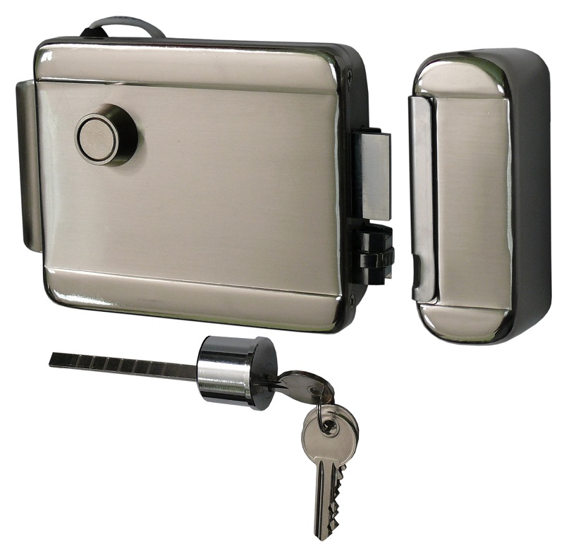 ST-RL073SI-NK замок электромеханический Smartec, накладной, НЗ, универсальный DIN, цилиндр снаружи, кнопка изнутри, питание 12VDC/1А, никелированная сталь, -40°+50°C, 150х105х40 мм.