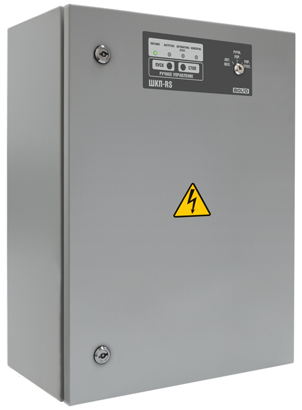 ШКП-18RS (М) шкаф контрольно-пусковой Болид; работа в режимах ручного/ автоматического управления; контроль исправности цепей управления двигателем; "Авария питания", "Автоматика откл.", "Двигатель включ.", "Неисправность" на встроенных световых индикаторах; 30 Вт; 40 А; 18 кВТ; IP54; 600x400x240 мм; 20 кг.