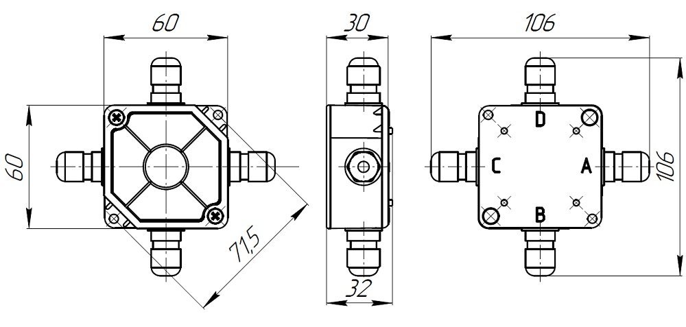 УС-4 Коробка соединительная, до 16 клемм , до 4 кабельных вводов; обеспечивают ввод подключаемого кабеля диаметром от 3 до 5,3 мм; коробка коммутационная для 4х4 проводов, 4 гермоввода под кабель3…5.3мм, IP65, t-раб. -40...+60°, 106х106х32 мм