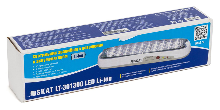 SKAT LT-301300 LED Li-Ion светильник аварийного освещения; 30 светодиодов; два режима работы; напряжение питания 187…242 В; защита АКБ от перезаряда и глубокого разряда; время резерва до 6 часов; крепление на стену и потолок; Li-ion аккумулятор; IP20; +5...+40°С; 270х65х52 мм; 0,26 кг.