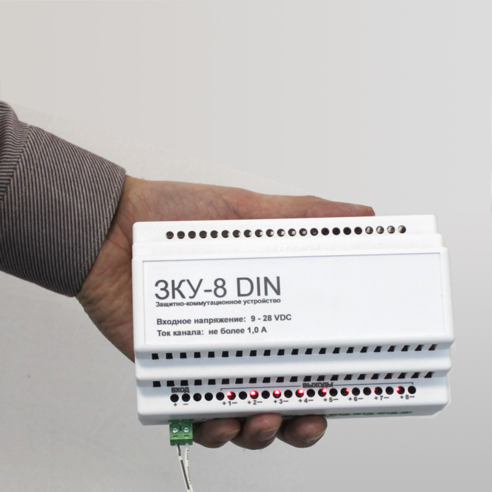 ЗКУ-8 DIN защитно-коммутационное уст-во на DIN рейку; 8 каналов, защита по току; I-мах.1 А (каждого канала); U-вх.9...28В; IP20; t-раб.-10...40°С; 140х100х70 мм; 0,15 кг.