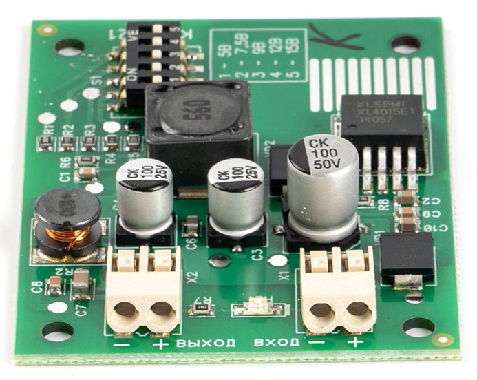 Универсальный преобразователь напряжения входного напряжения от 7 до 30 В в фиксированное выходное напряжение 5 | 7,5 | 9 | 12 | 15 В, максимальный ток — 1,5 А. Преобразователь представляет собой встраиваемый модуль на печатной плате размером 49х64 мм. На плате расположены входная и выходная соединительные колодки, индикатор выхода, переключатель выходного напряжения.