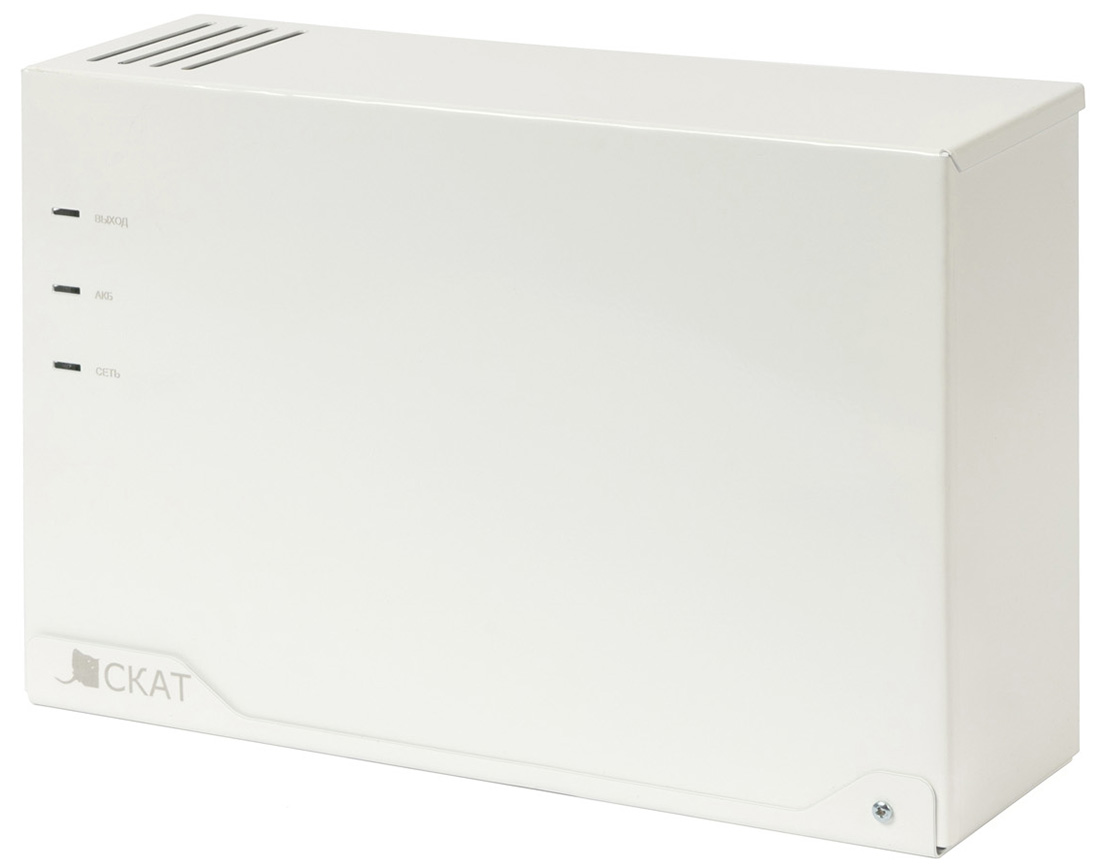 СКАТ-2400М источник вторичного электропитания резервированный; 24 В; 1,5 А; корпус под 2 АКБ 7 Ач или 1 АКБ 17 Ач; соответствует ФЗ 123 и ГОСТ Р 53325-2012; 3 индикатора и информационный выход «Переход на резерв»; защита выхода от перегрузки и КЗ; защита нагрузки от аварии источника; защита АКБ от глубокого разряда; КЗ и переполюсовки; «холодный пуск»; IP20; -30…+40°С; 285х90х185 мм; 1,3 кг.