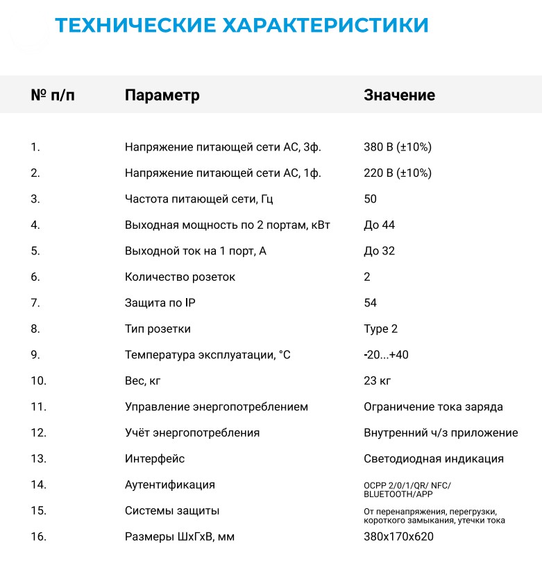 Станция имеет максимальную мощность 22 кВт и позволяет полностью зарядить ваше авто всего за 1-2 часа.