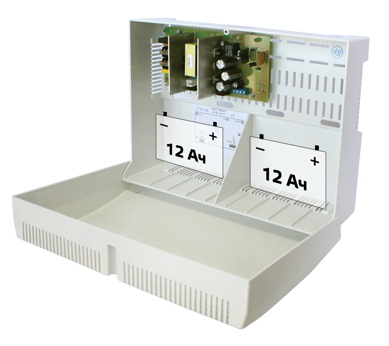 СКАТ-2400 источник вторичного электропитания резервированный; 24В, 3А; кратковременно и в режиме резерва до 3,5 А; корпус под 2 АКБ 12 Ач; соответствует ФЗ 123 и ГОСТ Р 53325-2012; 3 индикатора — Сеть, АКБ, Выход и информационный выход «Наличие сети»; защита выхода от перегрузки и КЗ; защита АКБ от глубокого разряда; КЗ и переполюсовки; контроль наличия АКБ; холодный пуск; IP20; -10…+40; 333х240х134 мм; 1,0 кг.