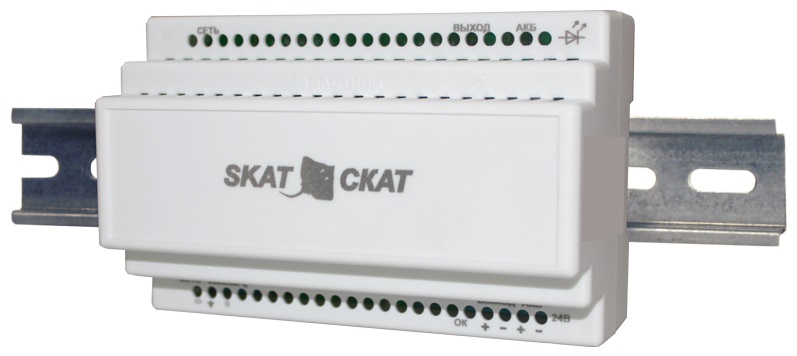 СКАТ-2400М DIN источник вторичного электропитания резервированный; 24В; 1,3А кратковременно и в режиме резерва до 1,5 А; внешний АКБ 4,5—7 Ач; монтаж на DIN рейку 35 мм; соответствует ФЗ 123 и ГОСТ Р 53325-2012; 3 индикатора — Сеть, АКБ, Выход и один информационный выход; «Наличие сети» в формате «открытый коллектор»; защита выхода от перегрузки и КЗ; защита АКБ от глубокого разряда; КЗ и переполюсовки; контроль наличия АКБ; холодный пуск; IP20; -10…+40°С; 139х89х65 мм; 0,28 кг.
