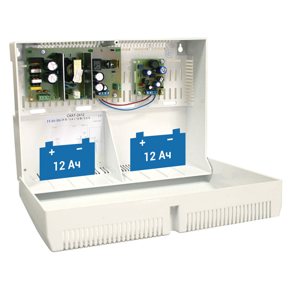 СКАТ-2412 источник бесперебойного питания 24В/3А, 12В/0,5А, кратковременно и в режиме резерва до 3 А, корпус под 2 АКБ 12 Ач; соответствует ФЗ 123 и ГОСТ Р 53325-2012. 3 индикатора и 3 информационных выхода - Сеть, АКБ, Выход, защита выхода от прегрузки и КЗ, защита АКБ от глубокого разряда; КЗ и переполюсовки; контроль наличия АКБ; холодный пуск; IP20; -10…+40 С; 333х240х134 мм; 1,1 кг.