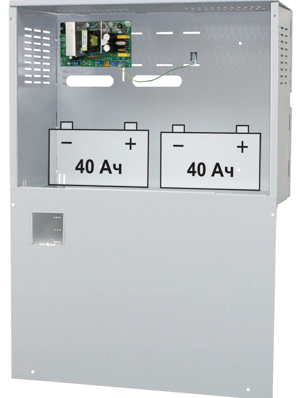 СКАТ-1200И7 (исп.5000) источник вторичного электропитания резервированный; 12 В, 5 А; 2 независимые АКБ; 2 канала зарядки; 150–250 В; 3 индикатора и 3 информационных выхода; защита выхода от перегрузки и КЗ, защита АКБ от глубокого разряда, КЗ и переполюсовки; контроль наличия АКБ; холодный пуск; под 2 АКБ 40 Ач; плоская упаковка; –10 до +40°С; 445х328х193 мм; 5,9 кг.