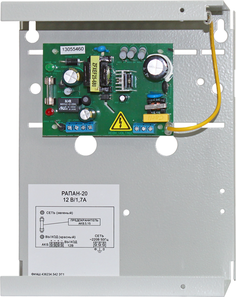 ББП РАПАН-20 источник вторичного электропитания резервированный; 12В/2А 12В, 2А; металлический корпус; под АКБ 7Ач; световая индикация режимов работы; защита АКБ; защита выхода от КЗ и перегрузки; IP20; -10...+40°С; 158х150х82 мм; 0,3 кг.