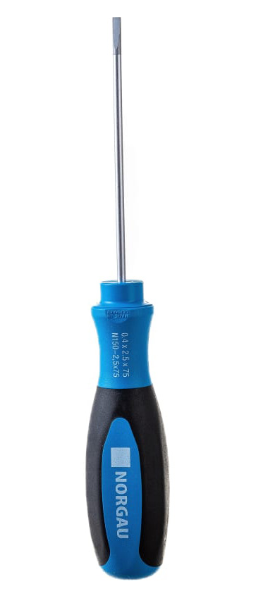 Шлицевая отвертка NORGAU SL2,5х75мм 062007025 используется при монтажно-демонтажных работах с крепежом, имеющим прямой шлиц. Ее стержень выполнен из хромованадиевой-молибденовой стали и подвергнут термической обработке, что обеспечивает высокую прочность. Хромовое покрытие наконечника повышает износостойкость инструмента. Оптимальная площадь контакта способствует более длительному сроку службы отвертки. Двухкомпонентная рукоятка не скользит в руке, обеспечивая удобный и крепкий захват.