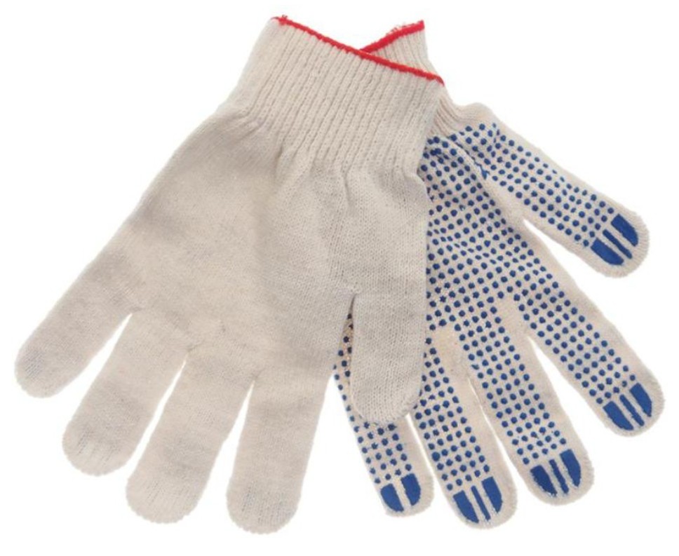 Перчатки х/б вязаные с ПВХ 4-х ниточные белые. Перчатки хлопчатобумажные с ПВХ нанесением предназначены для индивидуальной защиты рук.