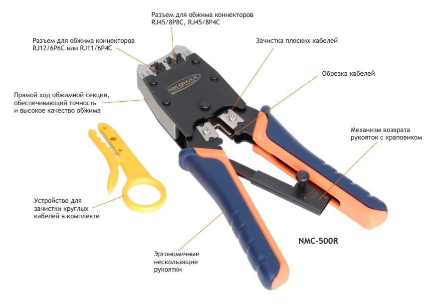 Обжимные инструменты (кримперы) предназначены для обжима коннекторов типа Registered Jack (RJ) на телефонных кабелях и кабелях передачи данных. Кримпер NMC-500R предназначен для обжима разъемов типа RJ45/8P8C, RJ12/6P6C и RJ11/6P4C. Инструмент оборудован устройством для зачистки плоского кабеля и поставляется с отдельным устройством для зачистки кабелей круглого сечения. Данный инструмент является профессиональным, благодаря “торцевому” обжиму.