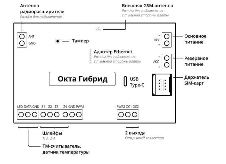 Окта Гибрид беспроводная контрольная панель для охраны и автоматизации Си-Норд; номинальное напряжение встроенного источника питания 14 В ± 0,28 В; номинальный ток, потребляемый от резервного источника питания 70 мА; максимальный суммарный ток по двум выходам 1000 мА; −30…+50 °С; 200×187×61 мм; 0,4 кг.