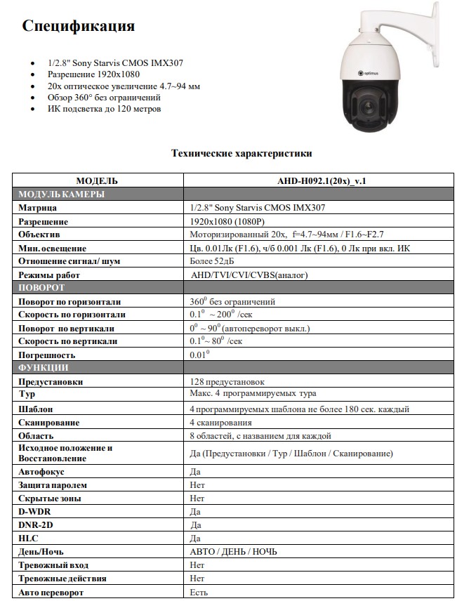 AHD-H092.1(20x) v.1 уличная камера видеонаблюдения Optimus; 1/2.8" Sony Starvis CMOS IMX307; 1920х1080 (1080P); 20x оптическое увеличение;объектив 4.7~94мм моторизированный; обзор 360° без ограничений, наклон 90°; скорость вращения 200°/сек.макс; 128 предустановок; AHD/TVI/CVI/CVBS (аналог); ИК-посветка 120 м, 8 ИК-диодов с линзами; D-WDR; антивандальный корпус, алюминиевый литой, IP66; -40°С...+60°С; 374х185 мм; 5 кг.