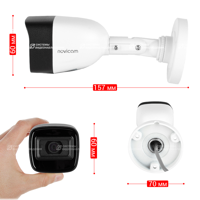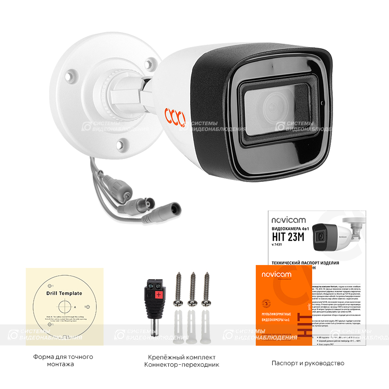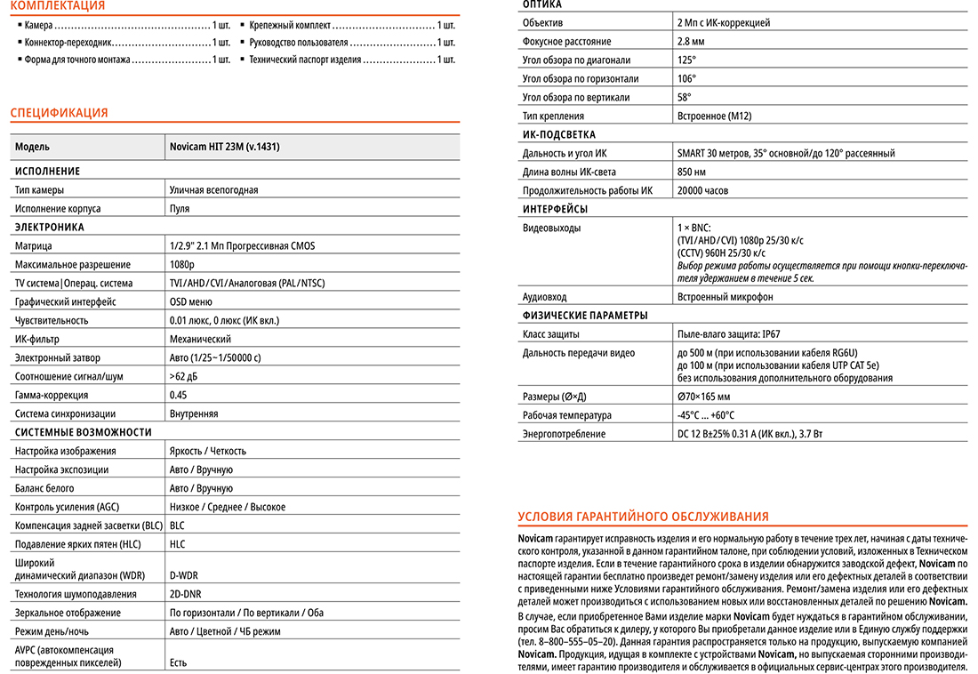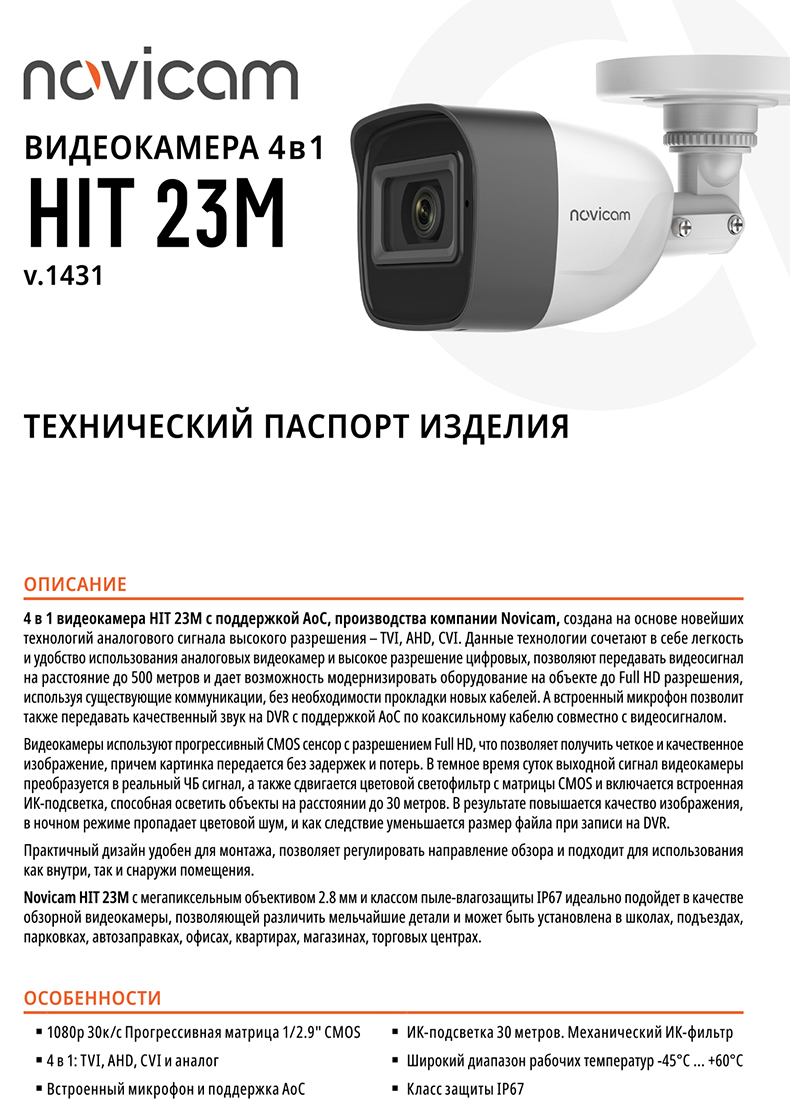HIT 23M (ver.1431) видеокамера уличная всепогодная Novicam; 1/2.9" 2.1 Mpix прогрессивная CMOS; 1080p; ИК подсветка SMART 30 м, 35° основной / до 120° рассеянный; объектив 2.8 мм, 2 Mpix c ИК коррекцией; угол обзора по В/Г/Д: 58°/106°/125°; встроенный микрофон; D-WDR; IP67; -45° ~ +60°С; ø70х165 мм.