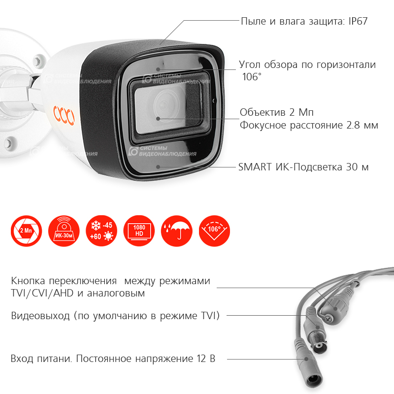Видеокамеры используют прогрессивный CMOS сенсор c разрешением Full HD, что позволяет получить четкое и качественное изображение, причем картинка передается без задержек и потерь. В темное время суток выходной сигнал видеокамеры преобразуется в реальный Ч/Б сигнал, а также сдвигается цветовой светофильтр с матрицы CMOS и включается встроенная ИК подсветка, способная осветить объекты на расстоянии до 30 метров. В результате повышается качество изображения, в ночном режиме пропадает цветовой шум, и как следствие уменьшается размер файла при записи на DVR.