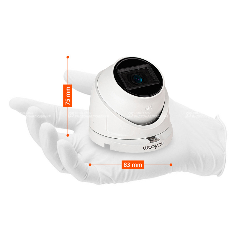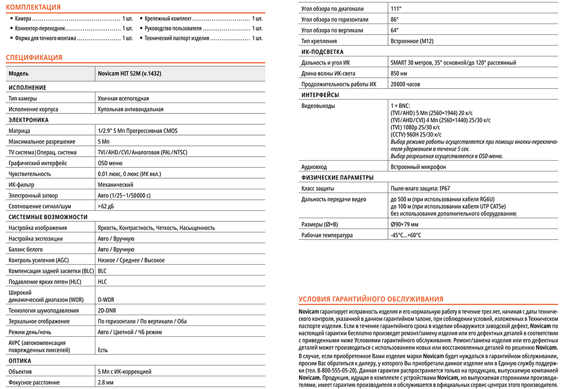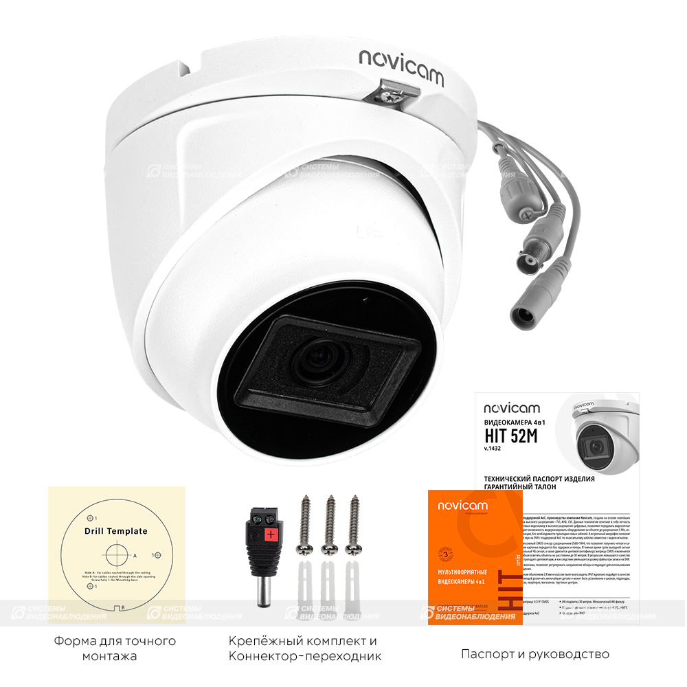 HIT 52M (ver.1432) видеокамера уличная всепогодная купольная Novicam; TVI, AHD, CVI и аналог; встроенный микрофон; 1/2.9" 5 Мп прогрессивная CMOS; (TVI/AHD) 5 Мп (2560×1944) 20к/с, (TVI/AHD/CVI) 4 Мп (2560×1440) 25/30 к/с, (TVI) 1080p 25/30 к/с, (CVBS) 960H 25/30 к/с; объектив 2,8 мм; угол обзора В/Г/Д: 64°/86°/111°; ИК-подсветка SMART 30 м; ИК фильтр механический; D-WDR; 2D-DNR; BLC; HLC; AVPC; IP67; -45° ~ +60°С; ø90×79 мм.